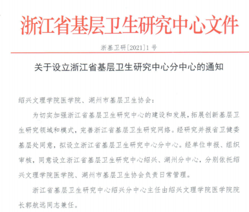 浙江省基层卫生研究中心绍兴分中心成立于2021年6月30日,绍兴分中心依托于绍兴文理学院开云最新官方进行日常管理,分中心主任由校党委委员、学院院长郭航远教授担任。