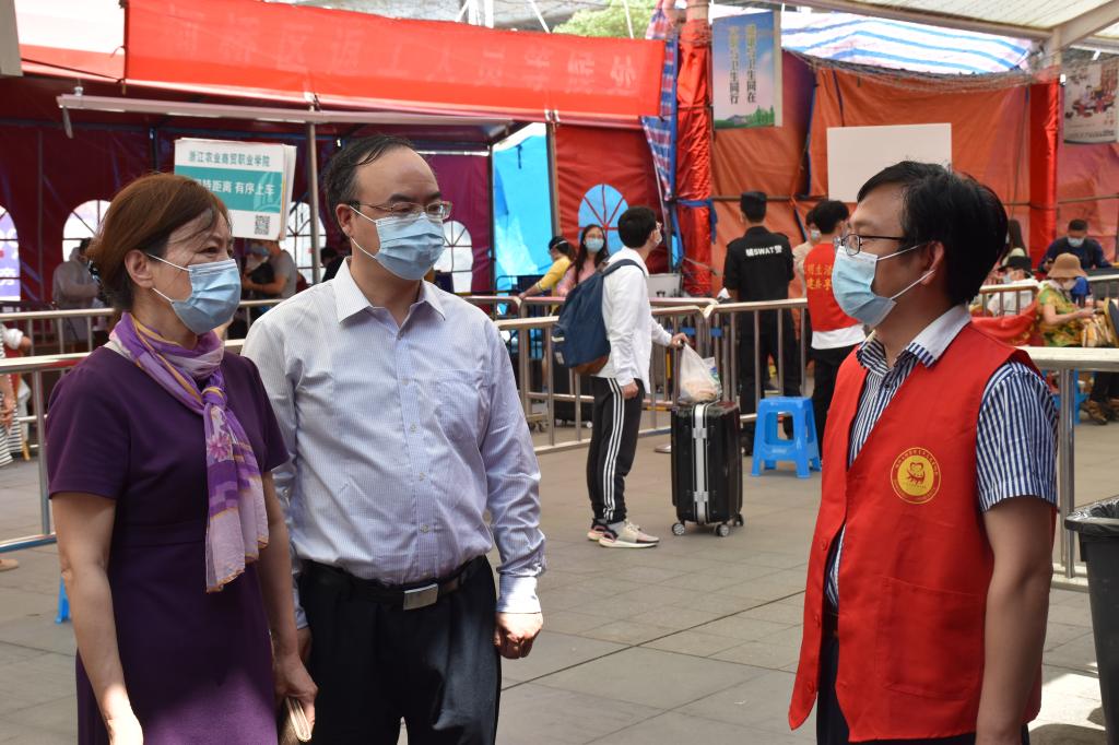 5月6日和8日两天,由开云最新官方党委副书记金坚强同志带队,20多名教师党员组成的先锋突击队承担了学校返校复学学生最集中、最重任务的绍兴北站的接站任务。教师党员志愿者发扬连续作战的精神,早上7点准时从学校出发,晚上8点回校,对每一位到站的同学进行仔细消毒、测温、扫码、引导上车等,暖心细心的做好接待服务,细致规范做好各项检查检测工作。在教师党员志愿者们的忘我工作和辛勤付出下,两天时间里,开云最新官方教师党员志愿者共接待了来自全国各地的1600名返校复学的同学,顺利、圆满完成接站任务。