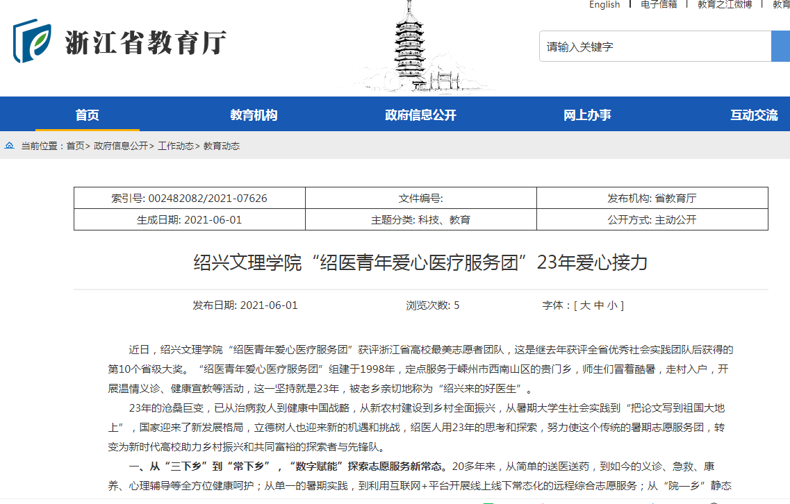 2021年6月,省教育厅官网专题报道我院爱心医疗服务团情况