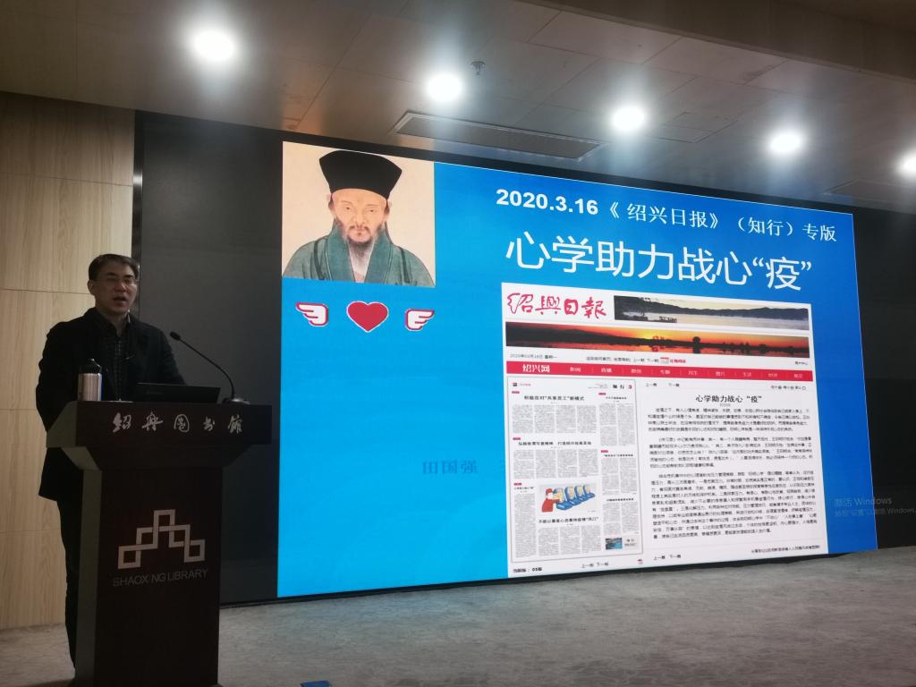 12月15日下午,绍兴图书馆联合各县市区公共图书馆邀请绍兴市心理卫生协会会长、心理卫生专家田国强主任医师作“心学助力战心‘疫’——疫情下的心理自助和情绪管理”直播讲座。讲座介绍了当下的疫情进展情况,介绍了疫情期间的普通人群、隔离人员、医护人员及其他人员的心理状况和自我心理调适、心理自助等方法,及如何用“阳明心学”助力大众的情绪管理等内容。目前学习观看这个讲座的受众人群有约1.4万人次。讲座针对了一线工作人员(公安、社区、医务人员、社会工作者等)和隔离管控人员的心理困惑问题、如何做好各类人群的心理自助和情绪管理作了很多有益的讲解和分享,使疫情下民众克服当下的心理情绪问题,保持乐观心态,强大内心能量,不断充实自我,做好科学防护,积极应对困难,帮助大家顺利地度过这一特殊时期,奉上一册清心实用的防疫心理指南。