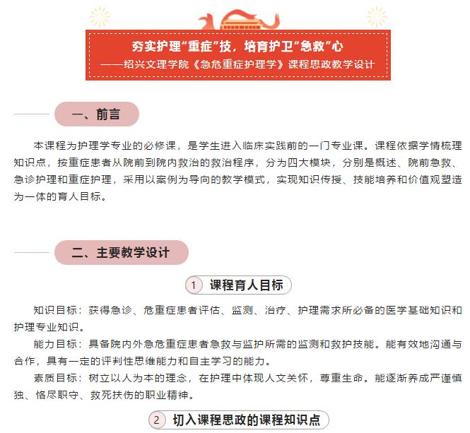 经组织专家评审推荐,学院赵伟英老师的《急危重症护理学》课程思政教学设计——夯实护理“重症”技,培育护卫“急救”心,入选国家教指委护理学类课程思政教学优秀案例分享,供全国护理院校学习借鉴。绍兴文理学院成为首批推送的八所高校之一。