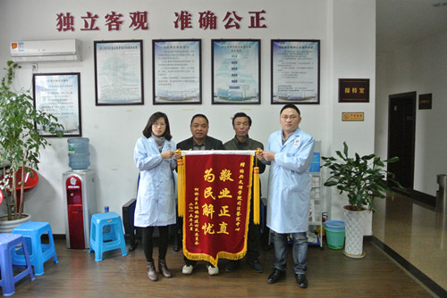 村委董立民主任与喻施莹的大伯向鉴定中心赠送锦旗