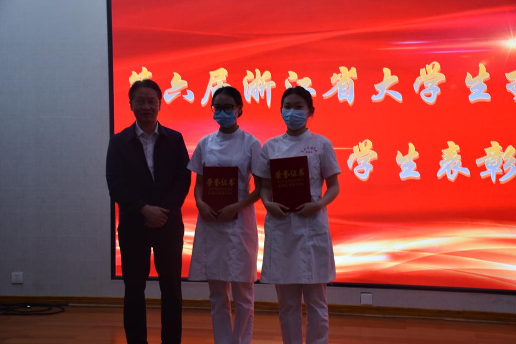 金坚强副书记宣读表彰浙江省第六届大学生护理竞赛获奖学生的文件,郭航远书记为表彰学生代表颁发荣誉证书。
