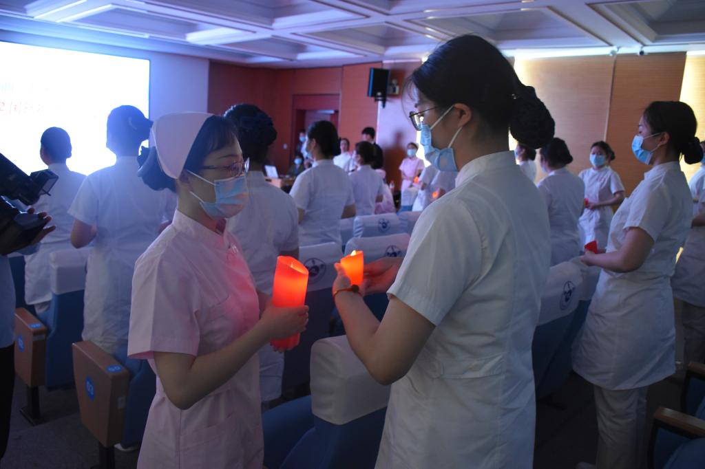 在授帽仪式上,护理系李晖老师作为教师代表为学生点燃象征着南丁格尔精神的红色蜡烛,并依次传灯,点亮了现场所有护生手中的蜡烛;五位护理前辈为现场所有学生代表授帽,此时氛围格外庄严而神圣。