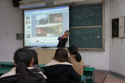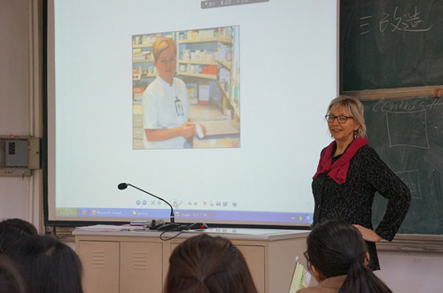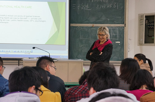 4月8日上午,在专业英语课堂中,Riitta先是为大家带来了来自她美丽故乡芬兰的视觉饕餮。从她的描述中,同学们领略到了一番地道的北欧湖光水色。她还为大家介绍了芬兰国家高等教育结构和芬兰米凯利应用科技大学的简单情况,以及芬兰医疗体系的情况。她强调,护士作为与病者最先的接洽的对象,具有咨询和预诊的重要作用,在临床上充当着重要的角色。