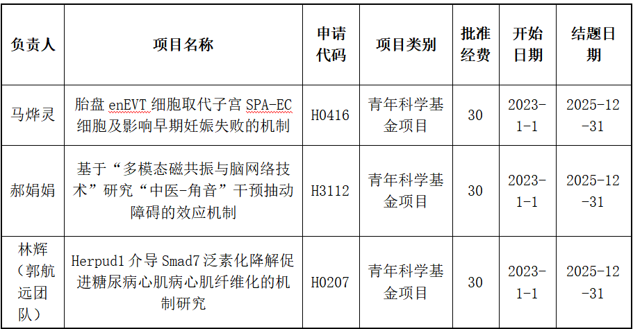 近日,2022年度国家自然科学基金项目评审结果正式揭晓。我院获批国家自然科学基金青年项目2项,分别是基础医学部马烨灵博士主持的“胎盘enEVT细胞取代子宫SPA-EC细胞及影响早期妊娠失败的机制”和临床医学部郝娟娟博士主持的“基于‘多模态磁共振与脑网络技术’研究‘中医-角音’干预抽动障碍的效应机制”。另外,临床医学部郭航远、池菊芳的心血管团队除了获得多项国自、省部级课题外,今年还申报了黄酒和康复两个省部级奖。