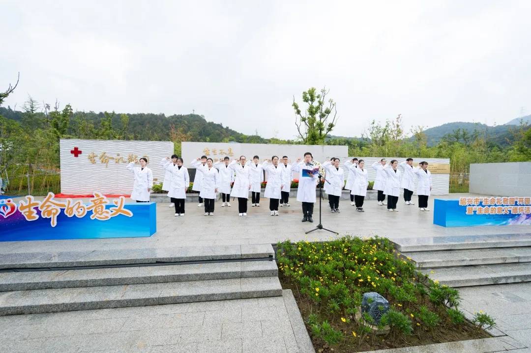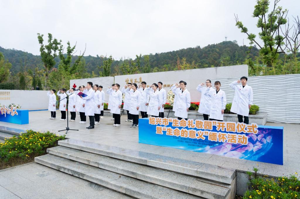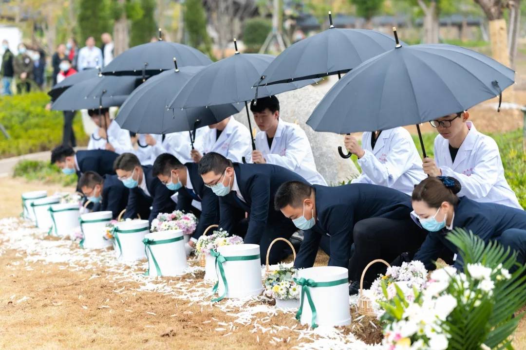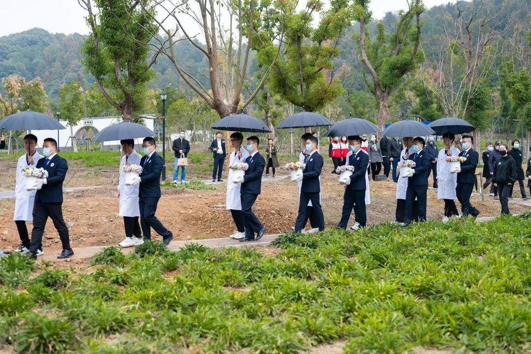 活动现场,在全体嘉宾、家属的共同见证下,绍兴市副市长胡敏,浙江省红十字会党组成员、秘书长张孚传等6位领导共同为“生命礼敬园”揭碑。志愿者代表们向纪念碑敬献花环,器官捐献者、器官移植受者、器官捐献协调员、医务人员的子女以及热爱红十字人道事业的老师、新闻媒体人、小朋友们共同朗诵《生命的礼物》,马国庆老师领誓、20名学生代表庄严宣誓《医学生誓词》,以不同的形式向所有的捐献者表达深深的敬意!在小提琴的伴奏声中,我院8名学生和8位志愿者为8位遗体捐献者集体进行草坪生态安葬,荣耀回家,生生不息。