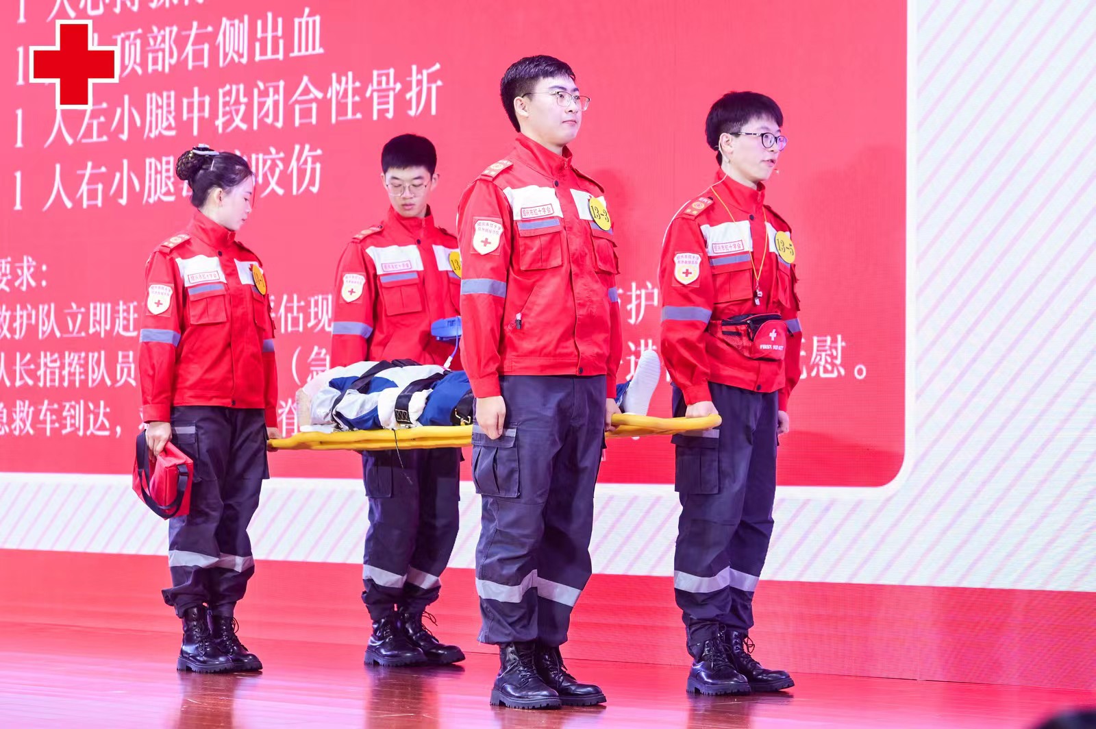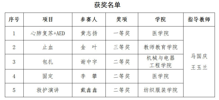 我校代表队五名参赛选手与浙江大学、浙江工商大学、温州医科大学等高校选手同台竞技,以饱满的热情、良好的风貌、严肃认真的态度和敢于争先的精神,积极参与五个项目的比拼,很好地展示了红十字救护员良好的心理素质、娴熟精湛的救护技能、充满人文的关爱之情和奋勇拼搏的精神风貌,最终斩获一等奖一项、二等奖三项、三等奖一项,并以小组第一的成绩在颁奖典礼上进行场景演练展示。