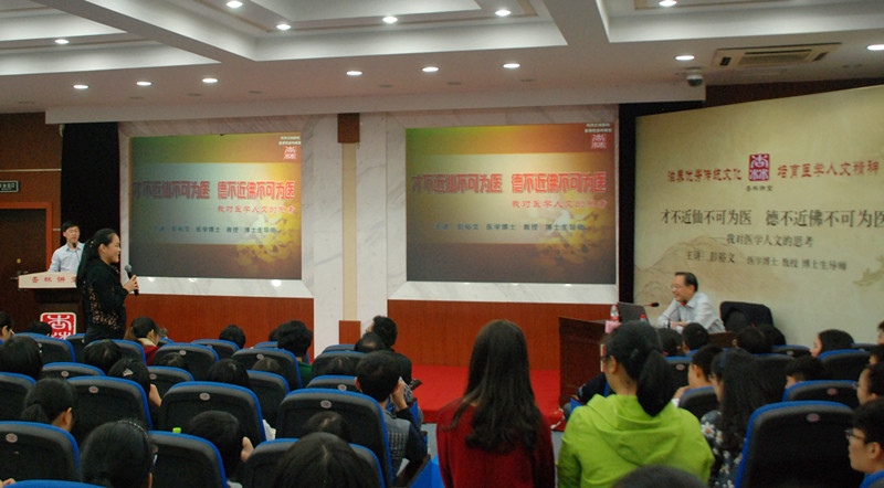 针对蒋晗的问题,彭裕文教授回答说,“医生应当有一颗人文心,一副科学脑”,对待晚期病人,一方面要想方设法延长他们的生命,同时还要尽量减轻他们的痛苦,提高他们生活的质量。如果每一位医生都能站在病人和病人家属的立场和角度考虑,这个问题就比较好解决了。至于宗教和医学的关系,彭教授说,西方有谚语“医生不信教,病人不上门”,虽然我是无神论者,但也要承认宗教中也有精华,我们要“取其精华,弃其糟粕”,对病人多一些人文关怀和人道主义帮助。