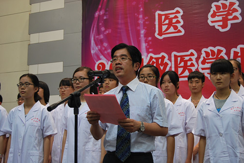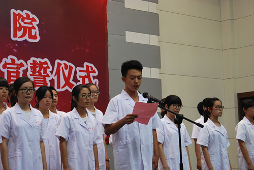 教授的带领下,全体2014级新生将右手放在左胸前庄严宣誓,决心为祖国医药卫生事业和人类身心健康奋斗终身。