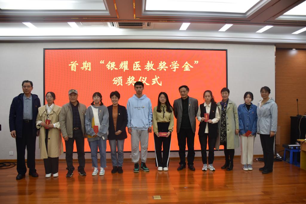 学校“银耀医教志愿服务队”名誉队长任光圆,党员志愿者代表周颖、周庆珍、葛志强、温多红、周形吉为获得2022年首期“银耀医教奖学金”的6名学生党员颁发奖金。