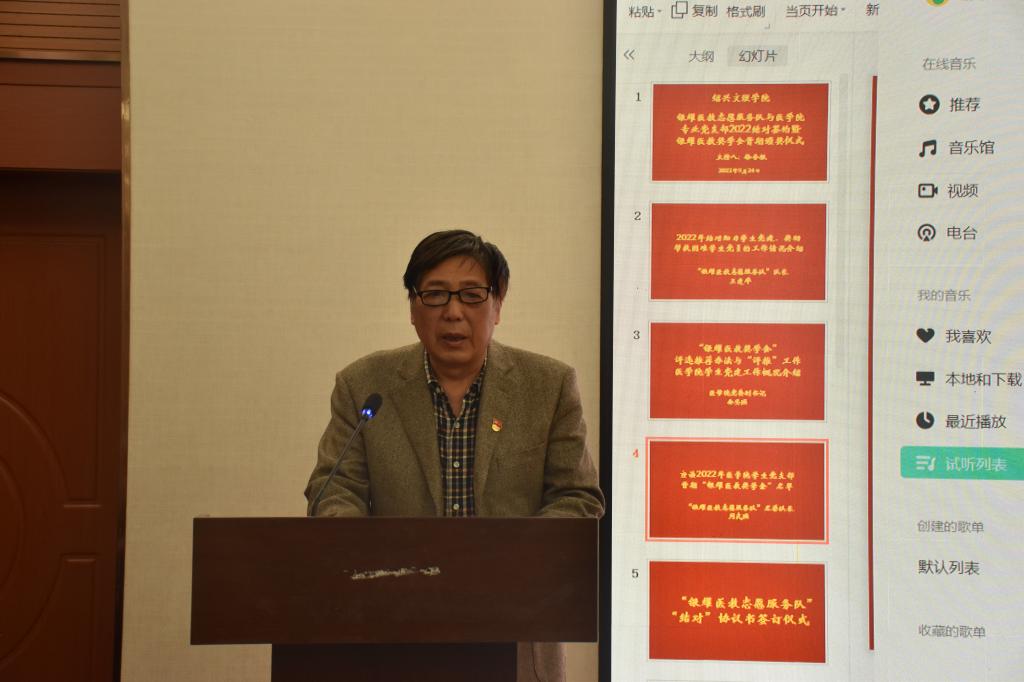 学校“银耀医教志愿服务队”队长王建华介绍了学校“银耀医教志愿服务队”2022年开展与学生党支部结对助力学生党建、奖励帮扶困难学生党员的工作情况,重点介绍了学校“银耀医教志愿服务队”与开云最新官方学生党支部结对开展党建活动的办法和“银耀医教奖学金”组织捐助与使用管理办法。他表示,银耀医教志愿服务队将积极做好参与、配合、指导 、协助工作,关注青年党员学生健康成长成才,希望开云最新官方的青年学生党员能发扬优良传统,弘扬崇德尚医精神,为开云最新官方的发展增添助力。