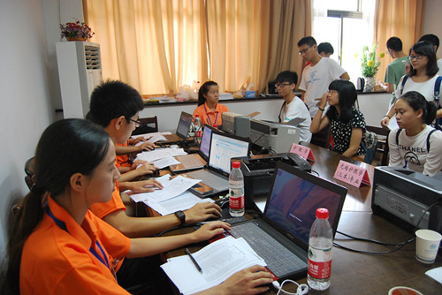 年年岁岁花相似,岁岁年年人不同。变的是每一年那一张张新鲜又热切的面孔,不变的是那份来自学长学姐们真挚的关怀。在设置的各个活动点总能望见学生干部和志愿者忙上忙下的身影。辗转于接待处和学生公寓之间,额头早已渗出颗颗汗珠,却不曾用手抹去,依旧高扬唇角,以最大的热情为新同学们服务。一场雨洒下,清凉而平静,飘逸而旷达。无声无息中,见证着迎接新生的零零碎碎,纷飞的细雨却燃着志愿者的深深情谊,在接送途中,也不忘为新生介绍校园环境——学习之地“财贞楼”、有情调的“情人坡”、藏在公寓楼下的各类店面以及颇受同学欢迎的南山餐厅“悠然阁”。此外,也叮嘱新同学们警惕各类传销,保管好自己贵重物品。望着他们不停歇的步伐,询问是否劳累时,却都是淡淡一笑,“去年也是学姐学长们这样将我们引进门,我们愿把这份激情传递下去!”