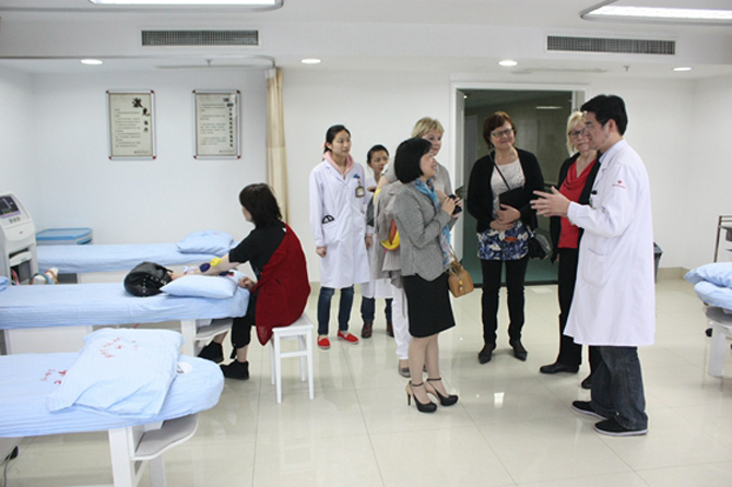访问期间,考察团到校附属第一医院实地参观了中荷康复中心、消化内科病房和放疗科病房。与医院护理部马红丽主任进行了深切交流,详细了解了康复中心的各项设施、病房智能输液系统和临终关怀病房等方面内容,表示希望以后能有更多的交流与学习机会。访问团还参观考察了绍兴市中医院推拿科、经络调理中心、针灸科、中药展示区等中医药特色科室和区域,听取了针推科沈灏主任有关针灸推拿的适应症、禁忌症、经络穴位的分布以及中医脏腑理论介绍。
