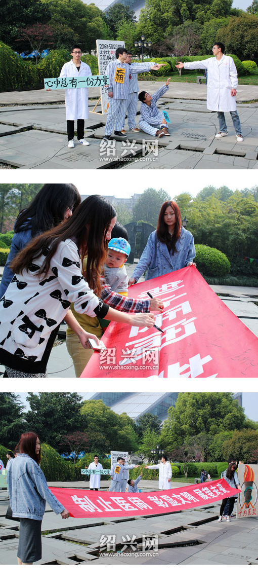 3月30日上午,我院20多名学生在城市广场开展“行为医塑”活动,面对到城市广场来休闲的绍兴市民,现场表演了医患之间相互提防关系紧张、心中却总有一份力量、未来一定值得期望等3个场景。