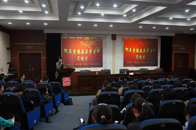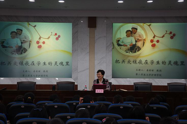 姜安丽教授从护理人文关怀教学的理论依据、内在机制及如何应用等三个方面依次展开。她首先指出护理的本质就是关怀,护理工作者要以人为本,关注人和尊重人。针对当今护理理念与方法的缺失导致护理人文的缺失这一现象,姜教授详细解释了护理人文关怀教学的理论依据、内在机制和必要性。姜教授通过多方列举亲身经历与临床经验,与大家分享了人文关怀中技术的特色特点。最后,她通过示范和列举的方法提出了“人文关怀教学”的具体方法——关怀小组活动。姜教授的教学示范讲授——“课前关爱5分钟——特蕾莎修女的一生”把全场气氛推向高潮,她饱含深情地引领大家追溯了特蕾莎修女无私奉献的一生,使在场的师生都接受一次心灵的洗礼,感受到特蕾莎修女的人性光辉。讲座最后,姜教授鼓励医护工作者和护理学的学生“怀大爱心,做小事情”,学习爱,创造爱,分享爱,给予爱。