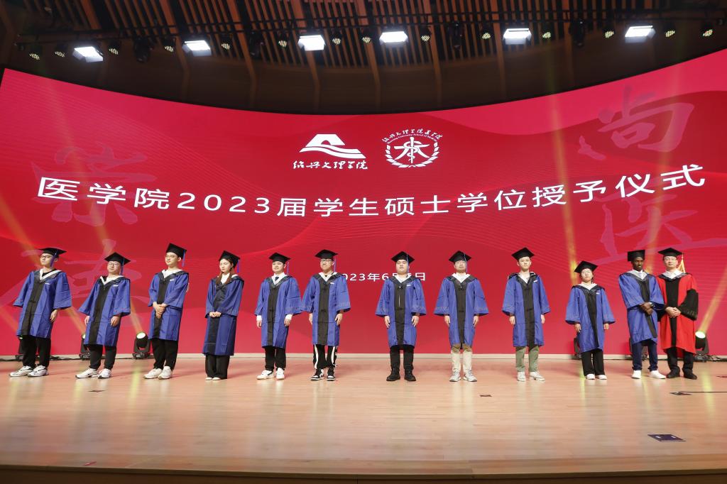 典礼在《中华人民共和国国歌》奏唱声中拉开序幕。学院院长为2023届硕士毕业生代表和本科毕业生代表授学位并合影留念。