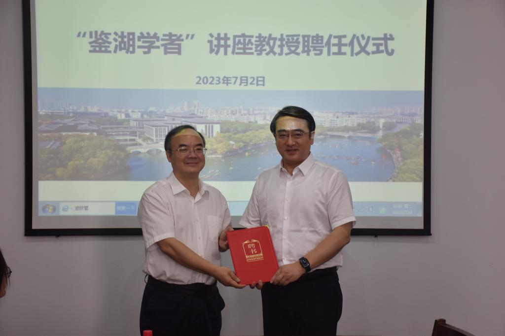 黄坚副校长为单春雷教授颁发“鉴湖学者”讲座教授聘书。