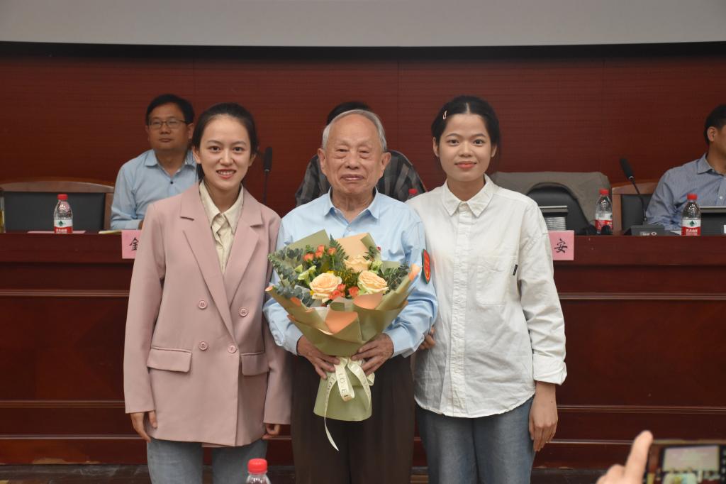 获奖代表向“银耀医教奖学金”主要捐助者、抗美援朝志愿军老兵、学校“银耀医教志愿服务队”顾问屠清安老师献花并赠送感恩贺卡。