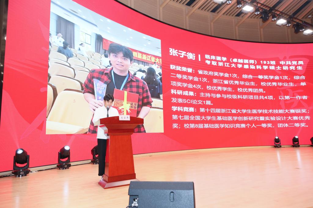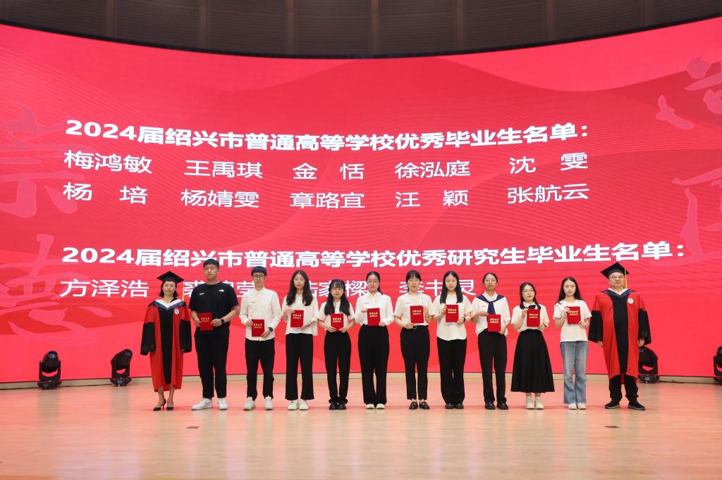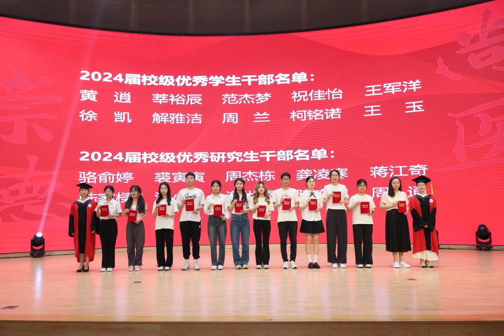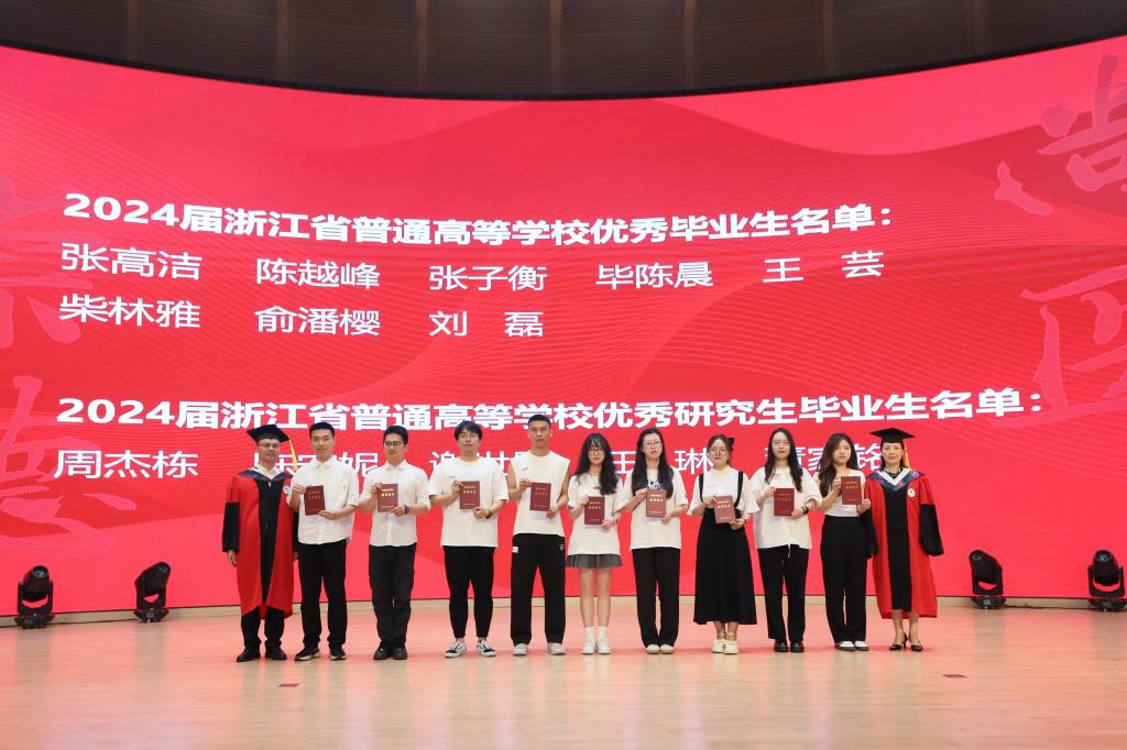 赵振华、袁敏为2024届浙江省优秀毕业生、2024届浙江省优秀硕士毕业生颁奖。陈国华、官莉莉为2024届绍兴市优秀本科毕业生和优秀研究生毕业生颁奖。屠传建、龚月江为2024届校级优秀本科毕业生和研究生毕业生颁奖。姚灿珍、金欣为2024届校级优秀学生干部和研究生干部颁奖。