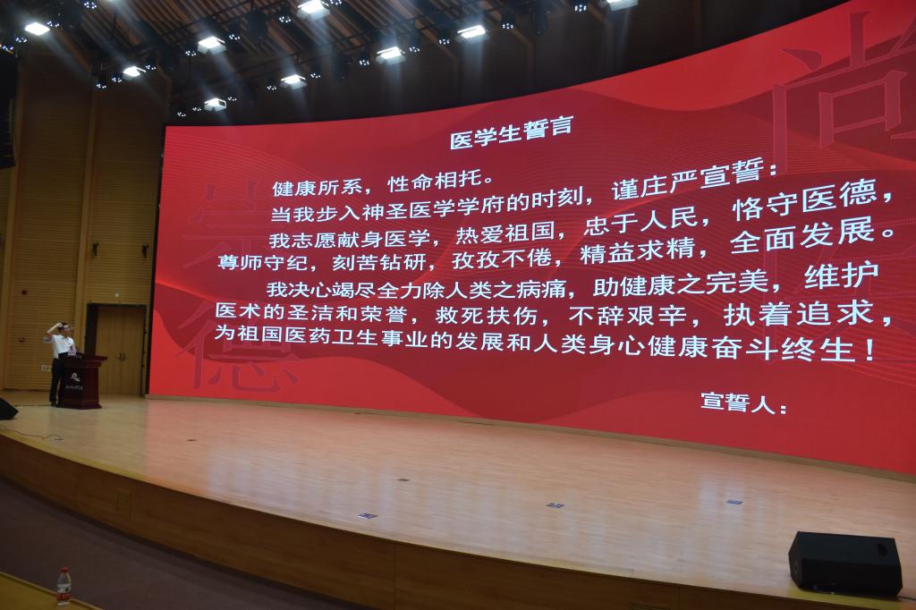 在赵振华老师的领誓下,全体学生进行了医学生宣誓仪式。(院办公室)