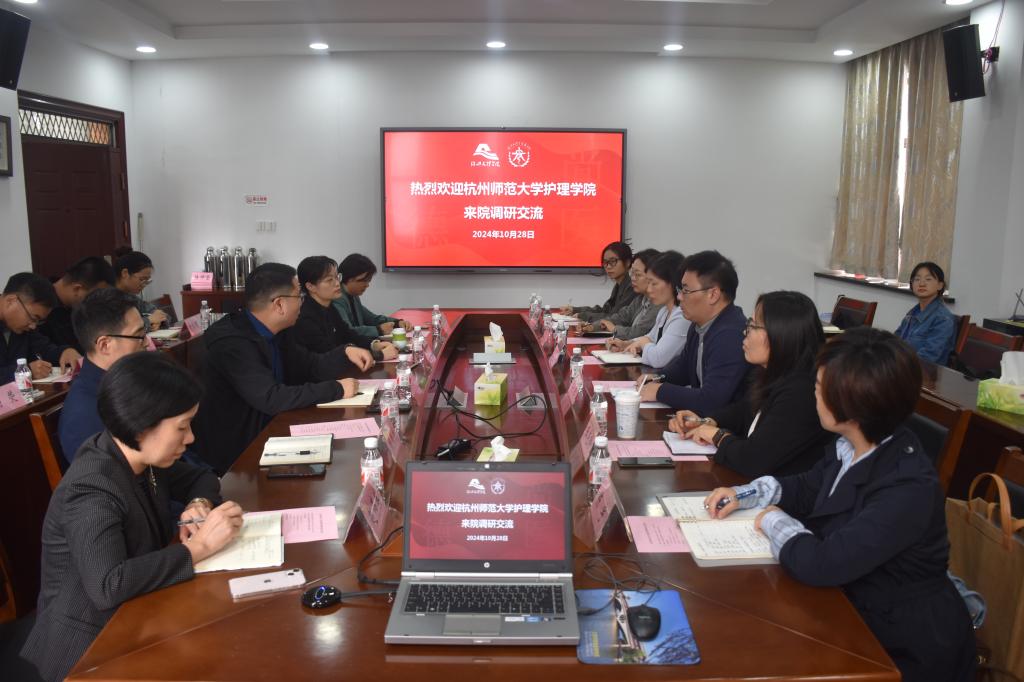 10月28日,杭州师范大学护理学院朱雪娇副院长一行来学院调研交流。学院党委副书记林国旗,副院长金欣、杨国军,以及护理系、医学实验中心、教研科和学生科相关负责人参加交流会。