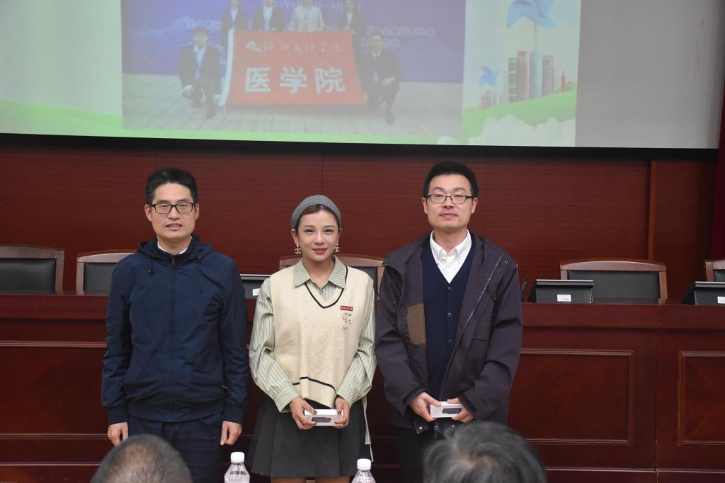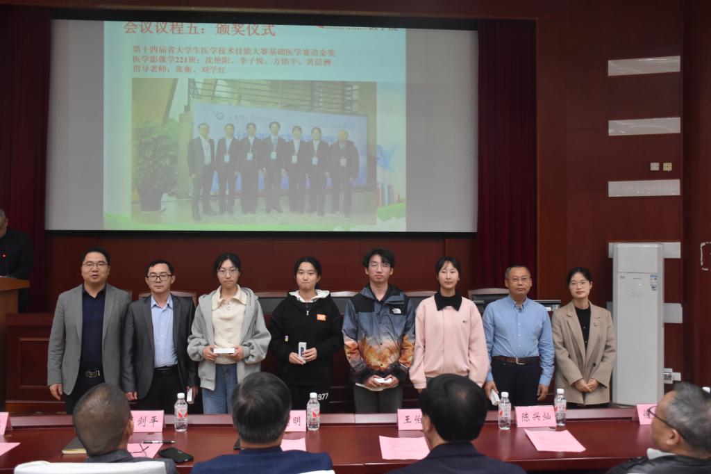 林国旗、金欣和杨国军为第十四届省大学生医学技术技能大赛基础医学赛道金奖医学影像学221班学生和指导老师,第九届“全国大学生基础医学创新研究暨实验设计论坛”本科院校总决赛基础临床赛道比赛:实验设计优秀成果奖(国家级)银奖学生和指导老师颁奖。