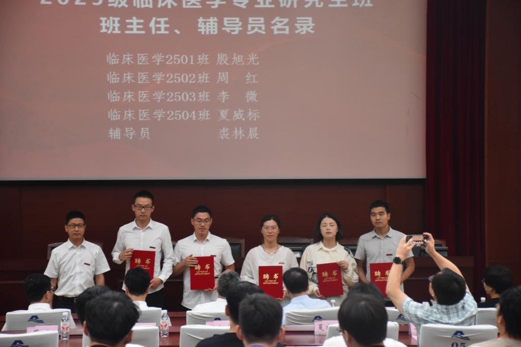 柳国庆为2025级临床医学专业研究生新生代表佩戴校徽。梁奇锋为研究生导师颁发聘书。