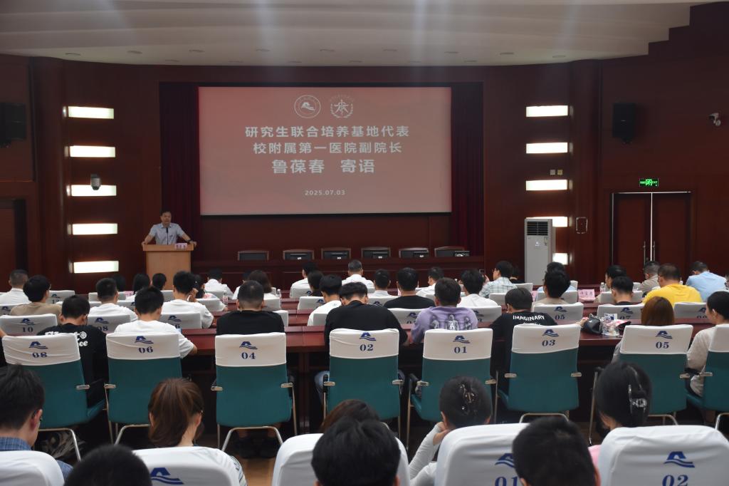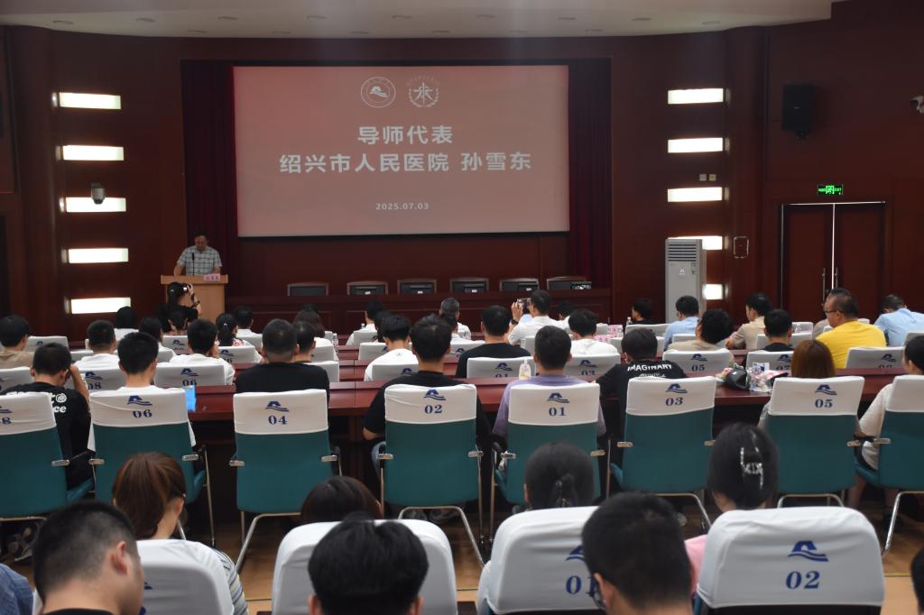 柳国庆讲话。他对2025级临床医学专业研究生表示祝贺和欢迎。他指出,绍医人要积极回应国家重大战略需求和人民生命健康的呼声,秉持“修德求真”的校训和“崇德尚医”的院训,保持务实勤奋“向上攀”的执着,勇闯“无人区”的胆识和“甘坐十年冷板凳”的定力,将自身的发展与“健康中国2030”战略蓝图和人民群众的健康福祉紧密相连。他勉励同学能够恪守仁心,筑牢职业根基,树立仁爱之心,遵守职业伦理,坚持学术规范,要精研医术,锤炼核心能力,牢固掌握基础理论、基本知识和基本技能,锤炼批判性临床思维,要精勤治学,融合临床科研,将科研的严谨性融入临床实践,用科学的方法提升临床决策水平。