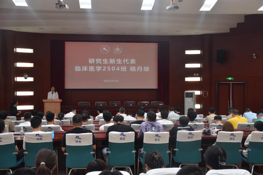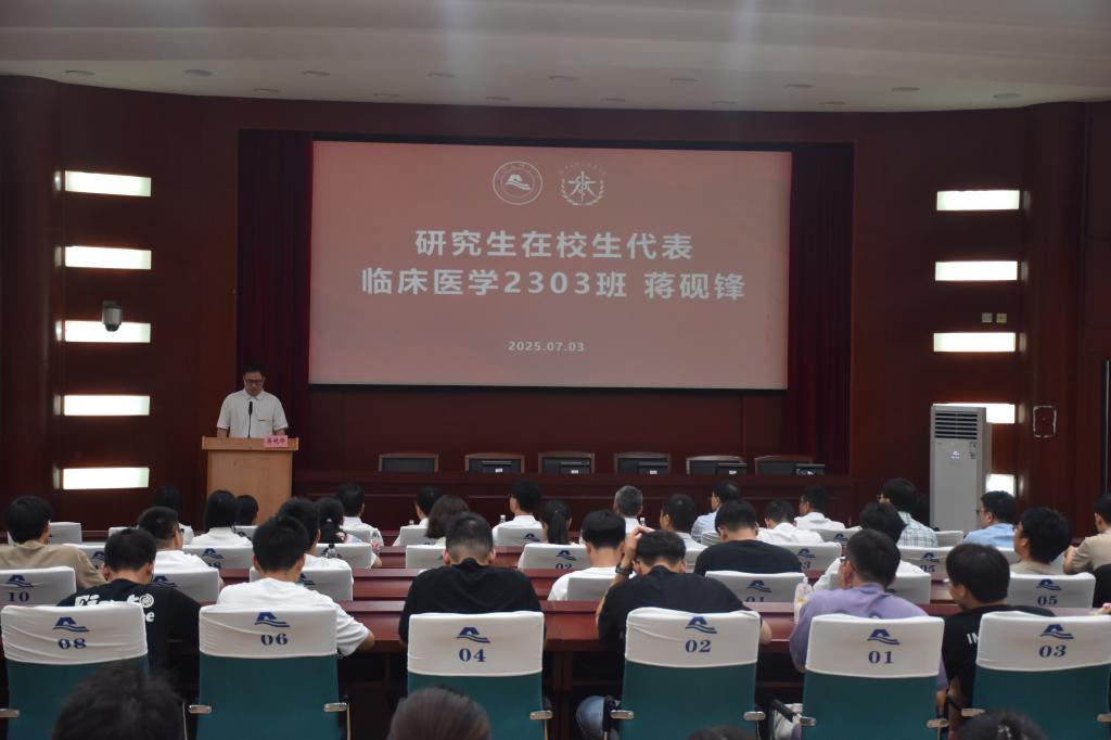 新生代表、临床医学专硕2504班杨丹维,老生代表、临床医学专硕2303班蒋砚锋分别发言。