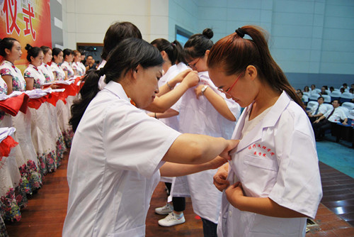 校附属医院副院长张宏卫教授,我院副院长张剑教授,副院长葛建荣主任医师,副院长陈三妹教授,夏国园教授,院党委委员、临床医学部主任黄丹文主任医师,护理系主任陈小萍主任护师,医学检验系主任刘丽华教授,医学影像系副主任马玉富主任医师,孙爱静教授等10位医学前辈为2016级医学生代表穿上了象征着衣钵相承、薪火相传的白大褂。