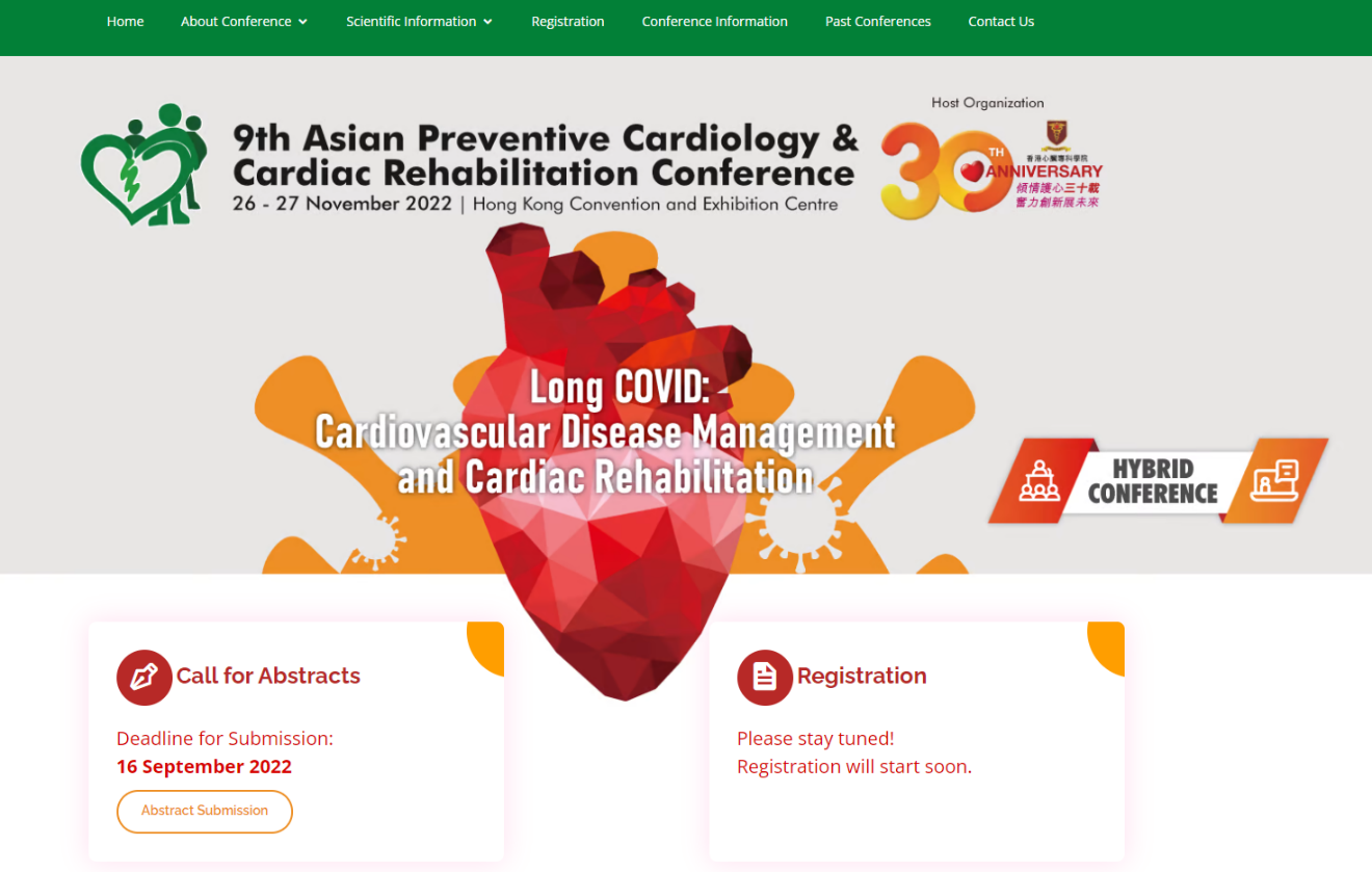 亚洲心脏病预防与心脏康复会议是由香港心脏病学院每两年举办一次的区域性科学会议。 2022 年 11 月 26 至 27 日,第九届亚洲心脏病预防与心脏康复会议 (APCCRC)将在香港会议展览中心举办。