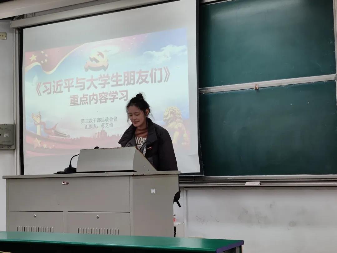 习近平新时代中国特色社会主义思想,具有极其重要的历史地位,习近平同志曾多次讲到:“青年最富有朝气、最富有梦想。”习近平多次寄望青年树立远大理想,放飞青春梦想。接着,蒋芝怡同学带领广大学生干部观看学习本书重要内容摘录,带领大家更深层次了解习近平同志对大学生的深切希望。