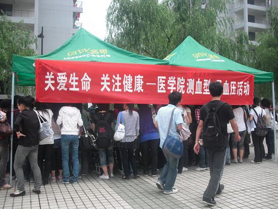 活动在下午晚餐时间继续开展,仍然陆续有同学来测血型,量血压。有些是路过的,有些是听同学介绍专程来的。虽然顶着炎炎烈日,工作人员和同学丝毫没有减少积极性。