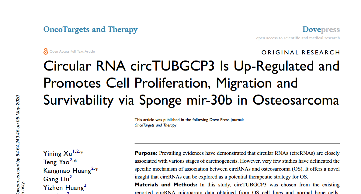 20205月,论文“Circular RNA circTUBGCP3 Is Up-Regulated and Promotes Cell Proliferation, Migration and Survivability via Sponge mir-30b in Osteosarcoma”被SCI杂志《Onco Targets and Therapy(IF=3.046接受发表。临床医学专业2019级硕士研究生徐屹宁为该论文的第一作者,马建军教授为该论文通讯作者,绍兴文理学院为文章第一署名单位。