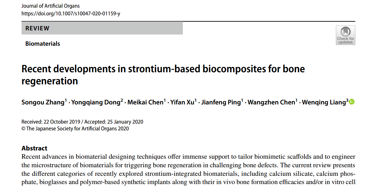 20201月,论文“Recent developments in strontium‑based biocomposites for bone regeneration”被SCI杂志《Journal of Artifcial Organs(IF=1.519)接受发表。临床医学专业2019级硕士研究生张宋欧为该论文的第一作者,梁文清教授为该论文通讯作者,绍兴文理学院为文章第一署名单位。