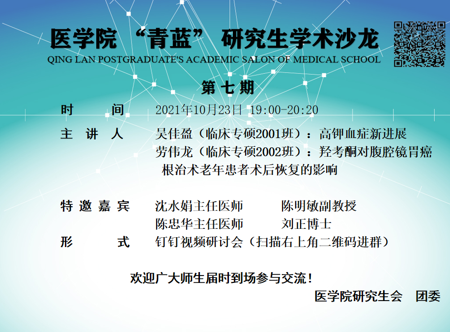 10月23日晚,第七期“青蓝”研究生学术沙龙活动通过钉钉在线上开展。本次沙龙的特邀嘉宾为沈水娟主任医师、陈忠华主任医师、陈明敏副教授、刘正博士。主讲人为我院2020级临床医学专硕研究生吴佳盈和劳伟龙。临床医学专硕全体研究生以及部分本科生参加了本次活动。