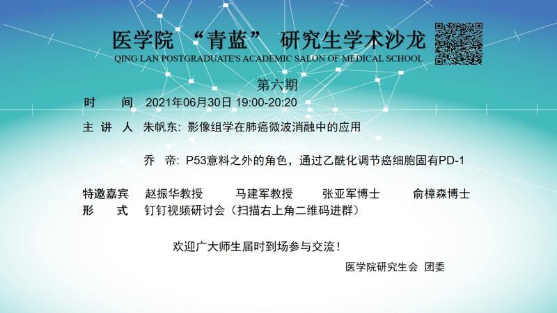 630日晚,第“青蓝”研究生学术沙龙活动通过钉钉在线上开展。本次沙龙的特邀嘉宾为赵振华教授马建军教授张亚军博士俞樟森博士。主讲人为我院2020级临床医学专硕研究生朱帆东乔帝。临床医学专硕全体研究生以及部分本科生参加了本次活动
