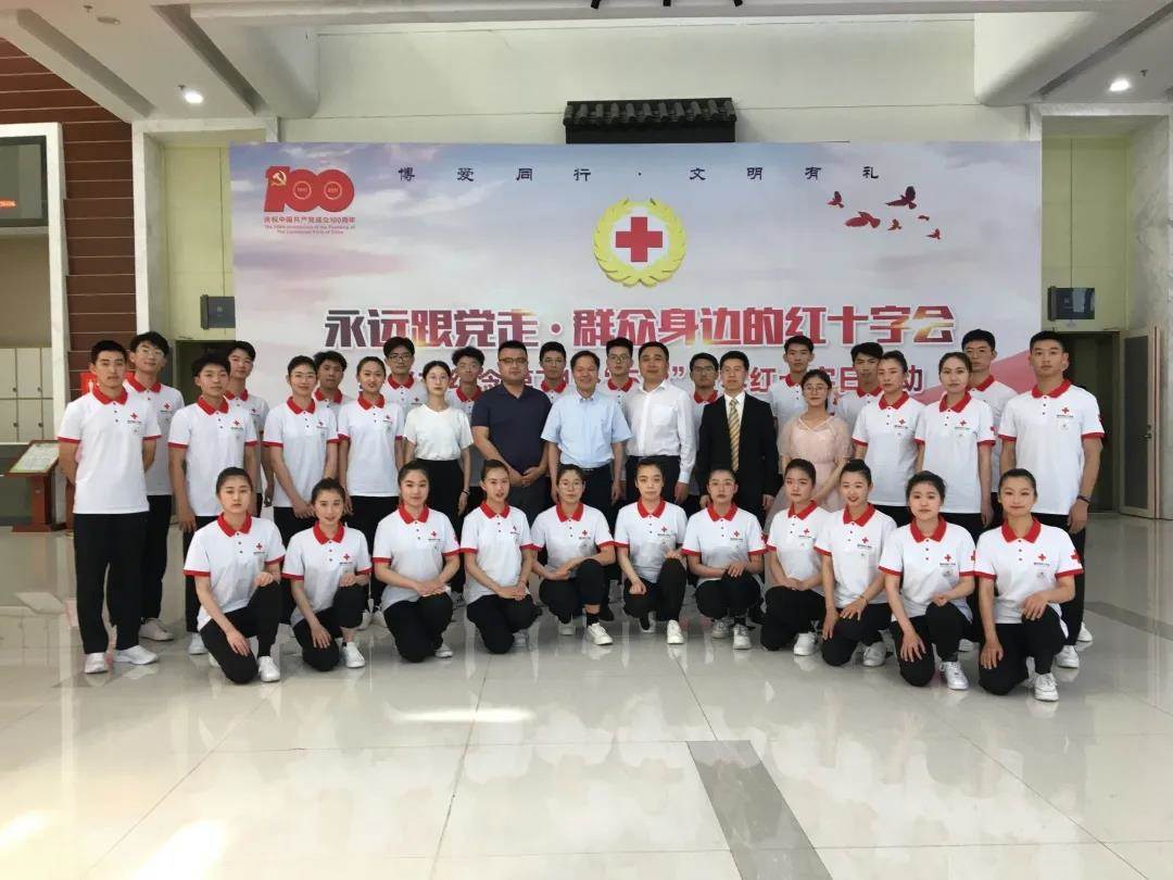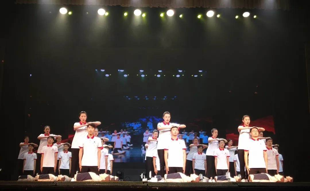(绍兴文理学院开云最新官方党委书记、院红十字会会长夏瑞明,绍兴文理学院团委书记、校红十字秘书长吕志伟,绍兴文理学院开云最新官方党委委员、教研科科长、院红十字会秘书长马国庆,绍兴文理学院开云最新官方辅导员李豪与“爱之翼”救护社展演队员合影)
