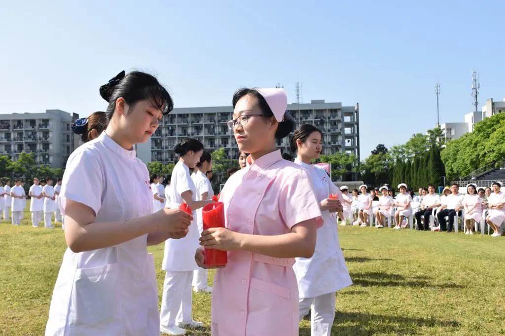 在授帽仪式上,护理系两位教师代表为学生点燃象征着南丁格尔精神的红色蜡烛,并依次传灯,点亮了现场所有护生手中的蜡烛;八位护理前辈为学生代表授帽,并与八位护理专业教师一起共同为全体护理学生授帽,此时氛围格外庄严而神圣。