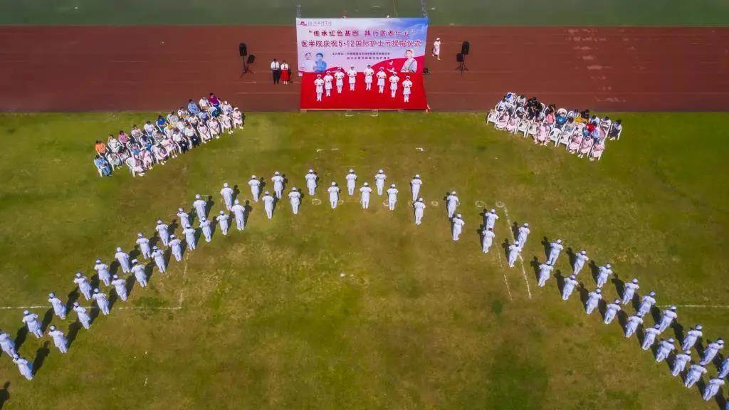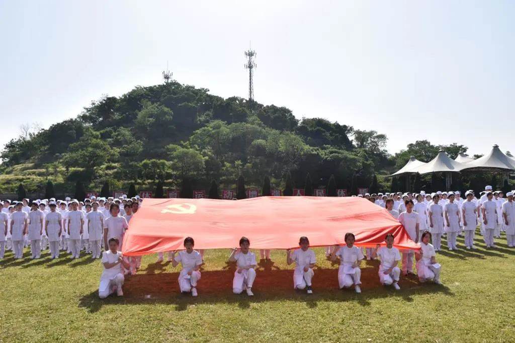 护理学党支部2019级学生护送党旗入场,展现 “1921-2021”造型,表达对建党百年的祝福和期许。