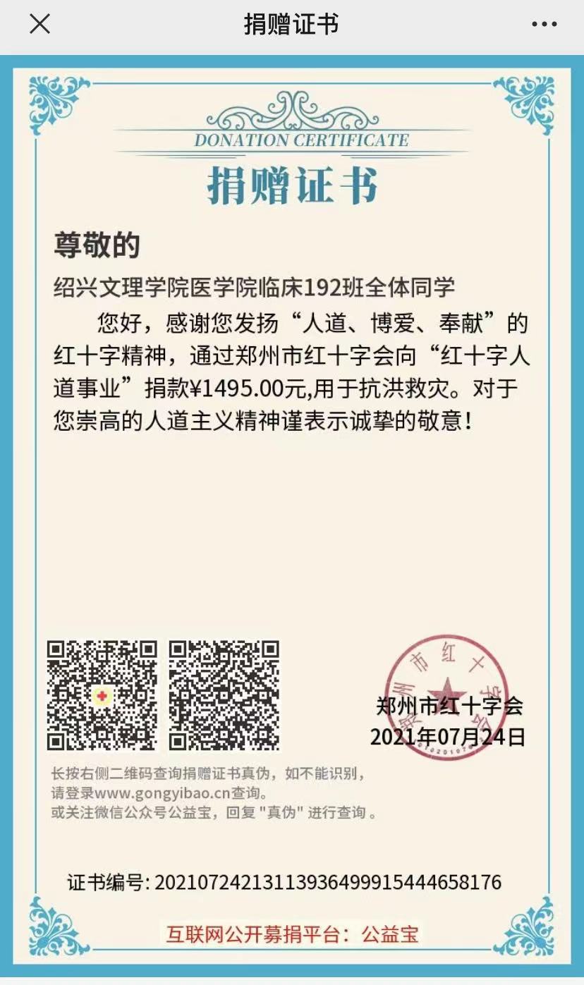 7月24日,学院临床192班全体学生发扬“人道、博爱、奉献”的红十字精神,通过郑州市红十字会向“红十字人道事业”捐款1495元,助力郑州市的抗洪救灾工作。