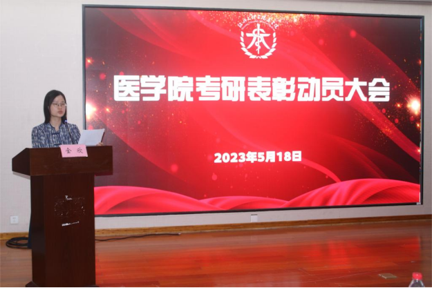 优秀考研学生代表康复191班闫玙同学发言。她感谢学校、学院、老师的辛勤培养,表示会始终铭记“崇德尚医”的院训,心怀梦想,不懈奋斗。