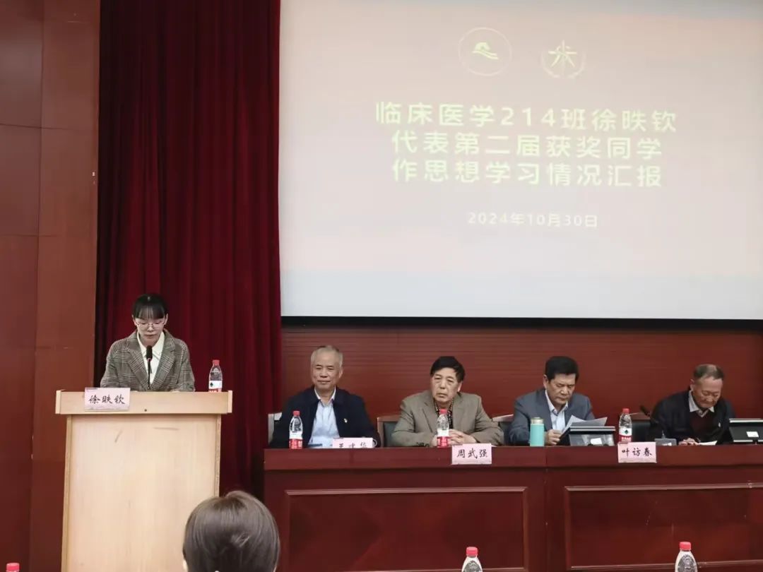 第二届“银耀”奖学金获奖学生党员代表临床医学214班徐昳钦汇报一年来的思想学习等简况。