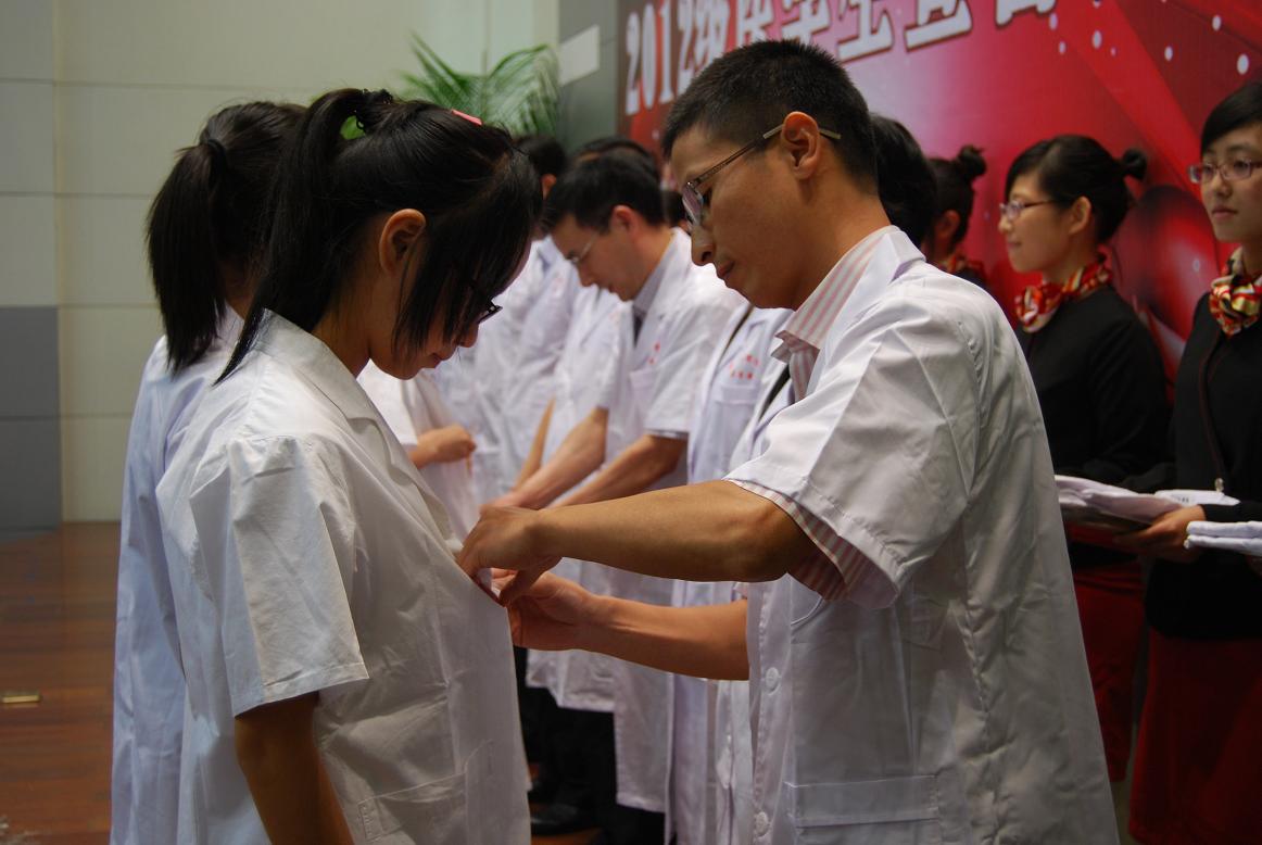 绍兴市中医院张居适院长,绍兴市第七人民医院楼正龙院长,校附属第一医院、绍兴市第一人民医院阎晓勤副院长,校附属第二医院、绍兴市第二人民医院谢垒副院长,绍兴市妇幼保健院方敏副院长,绍兴市第六人民医院方兴亮副院长,校附属医院党委副书记夏瑞明,开云最新官方副调研员夏国园,临床医学部主任黄丹文,护理系主任陈三妹,医学检验系主任刘丽华等十一位医学前辈为2012级医学生代表穿上了象征着衣钵相承、薪火相传的白服。在领誓人校附属医院副院长张宏卫教授的带领下,全体2012级新生将右手放在左胸前庄严宣誓,决心为祖国医药卫生事业和人类身心健康奋斗终身。