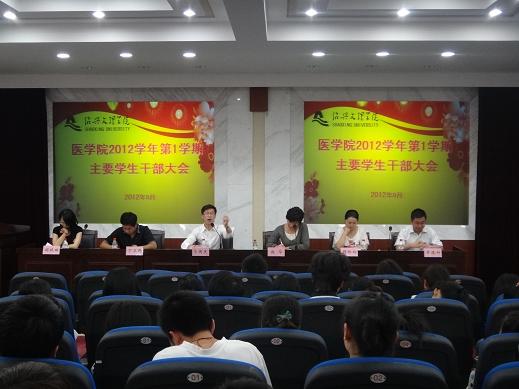 马国庆副科长用“平稳有序、顺利推进、面上展绿、点上开花”十六个字总结上上半年学生工作所取得的成绩,并肯定了我院学子在考研、科研、救护技能大赛及职业规划大赛等众多活动中的突出表现。他围绕创新和丰富思想政治教育形式和内容,切实增强大学生思想政治教育的实效性;认真做好学生管理和服务,提高工作水平,确保校园安全稳定;加强引导与激励,探索学风建设新途径,促进学生成长成才;加强创新精神与实践能力的培养,全面提升大学生综合素质;加强学工队伍建设,提高信息化水平,推动学生工作新发展等五个方面畅谈了下半年学生工作思路和具体举措。他还重点针对校园安全稳定、文明寝室创建、基础管理学风监测等工作进行了布置,就学生干部作用发挥和想与做关系处理等问题做了阐述和说明。