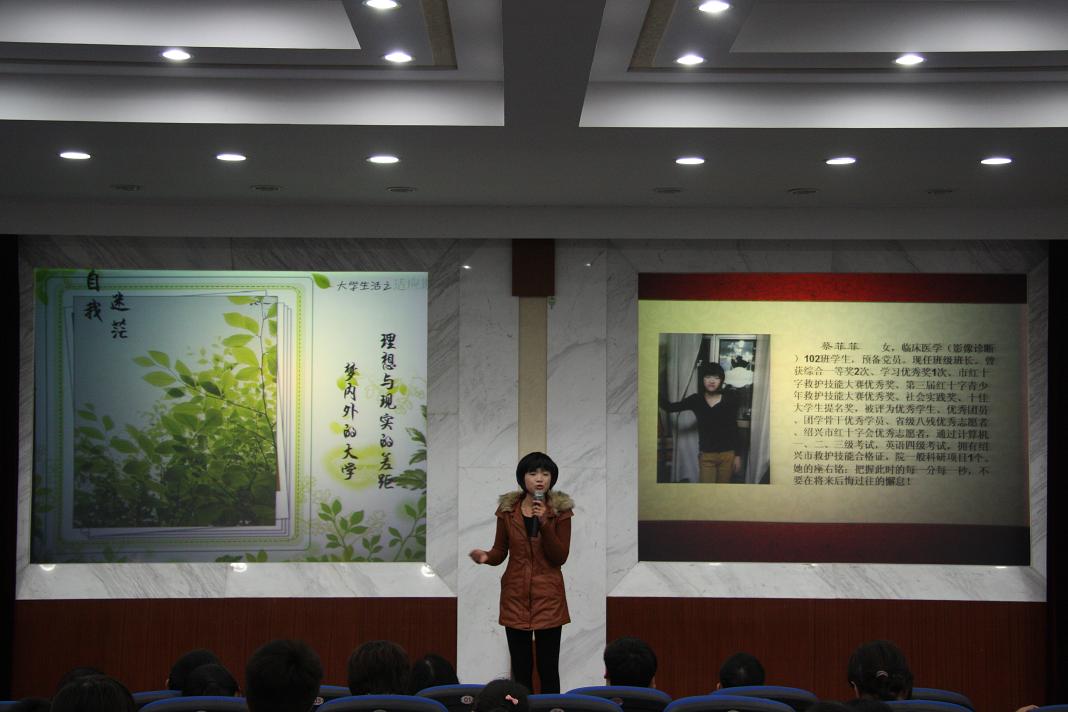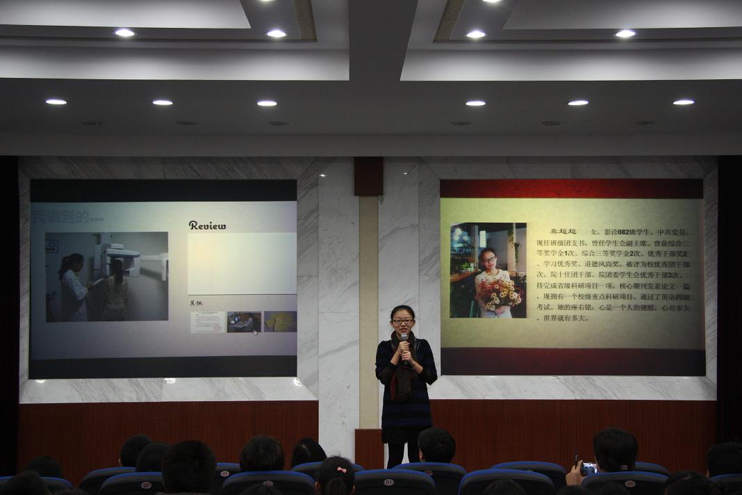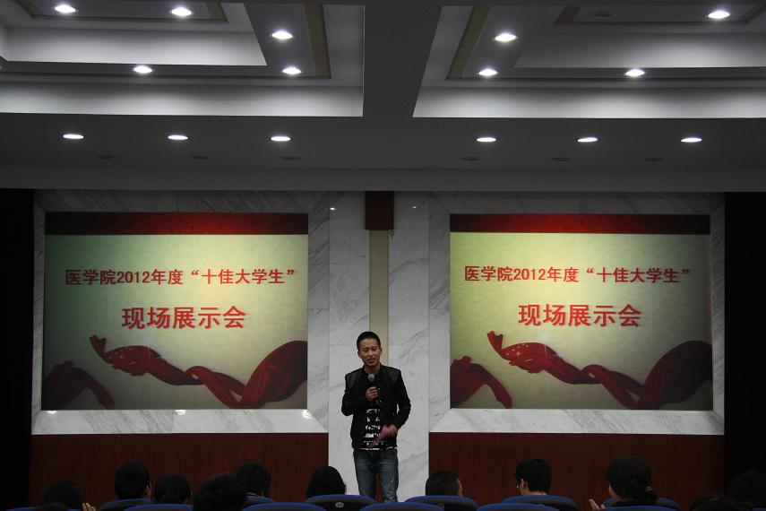 2012年11月19日晚,开云最新官方2012年度“十佳大学生”候选人现场展示会在财贞楼二楼报告厅隆重举行。经过学生自愿申报、班级推荐、院学生科组织初审、候选人基本情况公示,最终确定的15位开云最新官方2012年度“十佳大学生”的候选人将依次上台展示。院党委副书记吴剑平、临床医学部主任黄丹文、医学检验系主任刘丽华、学生科副科长马国庆、团委书记赵华、全体辅导员及部分班主任代表和全院170余名学生观看了精彩的角逐并参加了现场投票。