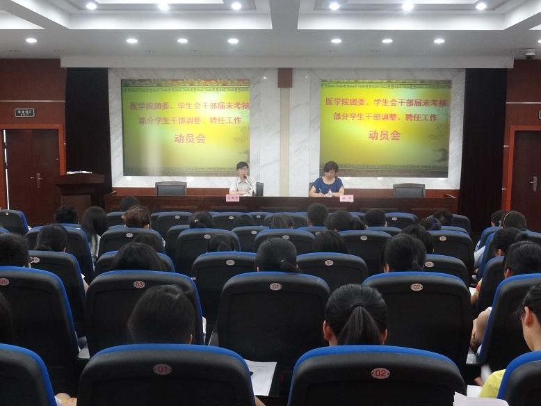 5月18日中午,院第六届团委、学生会干部届末考核及部分学生干部调整、聘任工作动员会在财贞楼二楼报告厅举行。院第六届团委、学生会全体学生干部,辅导员助理,在校生各班班长、团支部书记,党员督察队成员近170人参加了会议。