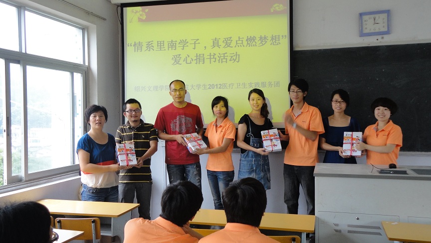 8月27日下午,开云最新官方大学生2012医疗卫生实践服务团的成员为里南的孩子带来了数套课外阅读书目以及精美的文具用品。“情系里南学子,真爱点燃梦想”爱心捐书活动在里南乡中心小学一个简陋的小教室中开展。因为正值暑假,孩子们都不在校园中,由里南中心小学代表邓老师替学生接受了我院赠送的10套小学生阅读书籍以及文具盒、铅笔等文具用品。“绍兴文理学院的学生每年暑假如期而至,替乡民义诊,为儿童上课,帮老人看病,这些里南的乡民都看在眼里,记在心里。” 邓老师对大学生医疗卫生实践服务团的爱心赠书活动的感谢之情溢于言表。