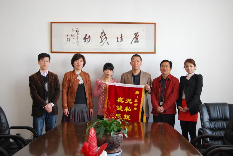 4月5日上午,夏肖连的表姐在教育学院党委副书记金坚强和辅导员陈盈盈的陪同下将“真诚感谢、无私援助”的锦旗送到我院,表达了对捐款师生的感激之情。我院党委副书记吴剑平、学生科、团委负责人接收了锦旗,并代表全院师生祝愿夏肖连同学早日康复,早日回到她所深爱的老师同学之中!
